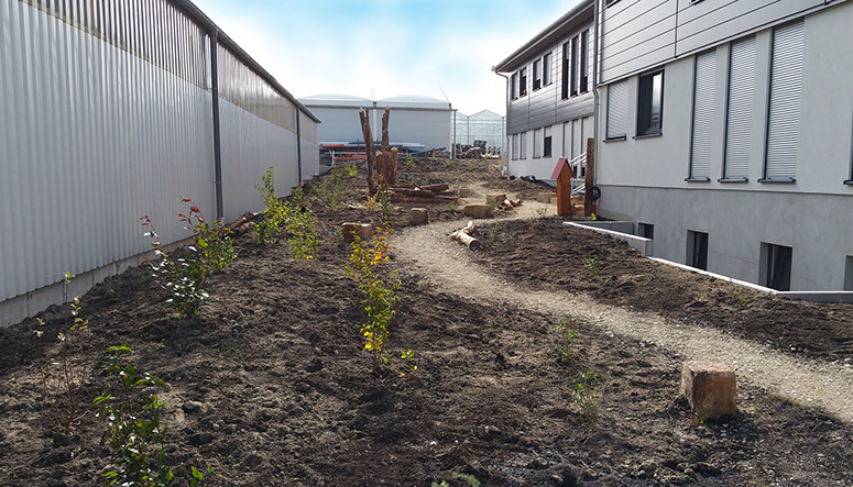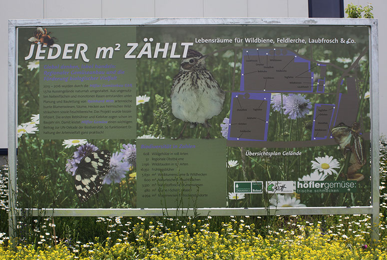 Um die Gewächshäuser und die neu gebauten Mitarbeiter-Unterkünfte herum wurde 2016 naturnah begrünt und somit weiterer wertvoller Lebensraum für bedrohte Flora und Fauna geschaffen. Außerdem haben die fleißigen Mitarbeiter der Firma Höfler im Herbst 2016 noch einen grünen Erholungsbereich direkt bei ihren neu gebauten Unterkünften erhalten, wo sie sich jetzt in ihren Pausen erholen und entspannen können.