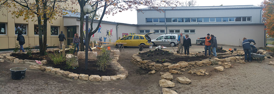 Erst wurde der Innenhof an dieser Grundschule neu gestaltet – dann folgte 2016 der Eingangsbereich. Mit Hilfe der Eltern | Lehrer | Kinder können erste Kosten gespart werden und außerdem macht so eine gemeinsame Aktion auch noch Spaß. Diese Beete, einschließlich Sitzpodest aus Holz, wurden in nur 2 Tagen angelegt und werten den vorher tristen und komplett versiegelten Pausenhof auf. Dort, wo heute noch die Autos stehen, soll der Hof im selben Stil weiter aufgewertet und begrünt werden. Ein Gewinn für Schule und Schüler… Hier wird es im nächsten Frühjahr blühen und der graue, versiegelte und trostlose Pausenhof wird auf Dauer verschwinden.