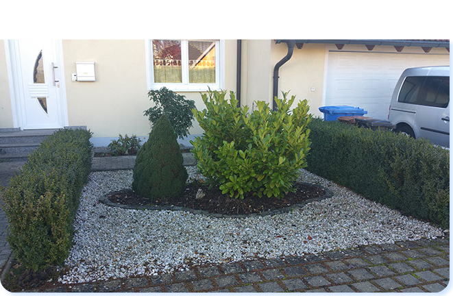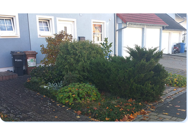 Leider sehen noch vieler unserer Vor-Gärten in Deutschland so aus. Nicht heimische Gehölze wie z.B. die giftigen (!) Zypressenhecken oder neuester "Trend": Mit Kies "gemulchte" Flächen. Und der oft vergebliche Versuch den Rasen Moos- und unkrautfrei zu halten mit zuviel oder zu wenig Dünger.