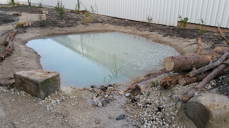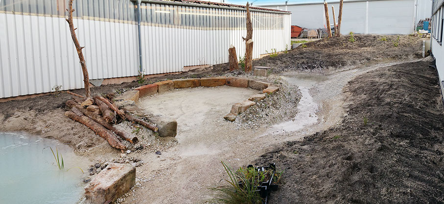 Der Erholungsbereich wurde innerhalb von 1 Woche komplett angelegt, bepflanzt und angesät. Der Teich wurde Probe-befüllt, um die Funktion zu testen. Da darf man sich wahrlich eine Pause gönnen oder?