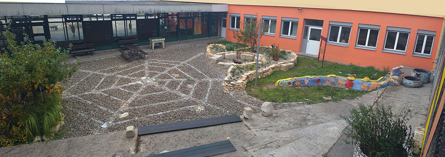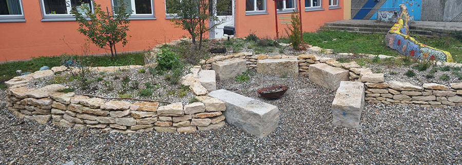 Erst wurde der Innenhof an dieser Grundschule neu gestaltet – dann folgte 2016 der Eingangsbereich. Mit Hilfe der Eltern | Lehrer | Kinder können erste Kosten gespart werden und außerdem macht so eine gemeinsame Aktion auch noch Spaß. Diese Beete, einschließlich Sitzpodest aus Holz, wurden in nur 2 Tagen angelegt und werten den vorher tristen und komplett versiegelten Pausenhof auf. Dort, wo heute noch die Autos stehen, soll der Hof im selben Stil weiter aufgewertet und begrünt werden. Ein Gewinn für Schule und Schüler… Hier wird es im nächsten Frühjahr blühen und der graue, versiegelte und trostlose Pausenhof wird auf Dauer verschwinden.